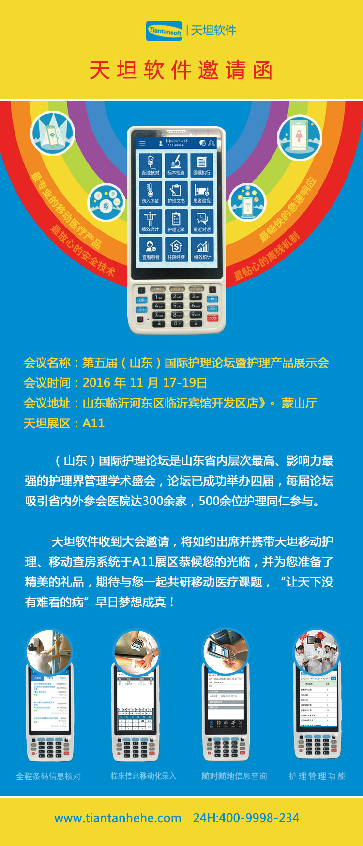 天坦軟件恭祝“第五屆(山東)國際護理論壇暨護理產(chǎn)品展示會”如期舉辦并取得圓滿成功,也期待這一次行業(yè)的交流盛會的到來,共同學(xué)習(xí)、共同進步。天坦軟件將于A11展臺前恭候您的光臨。